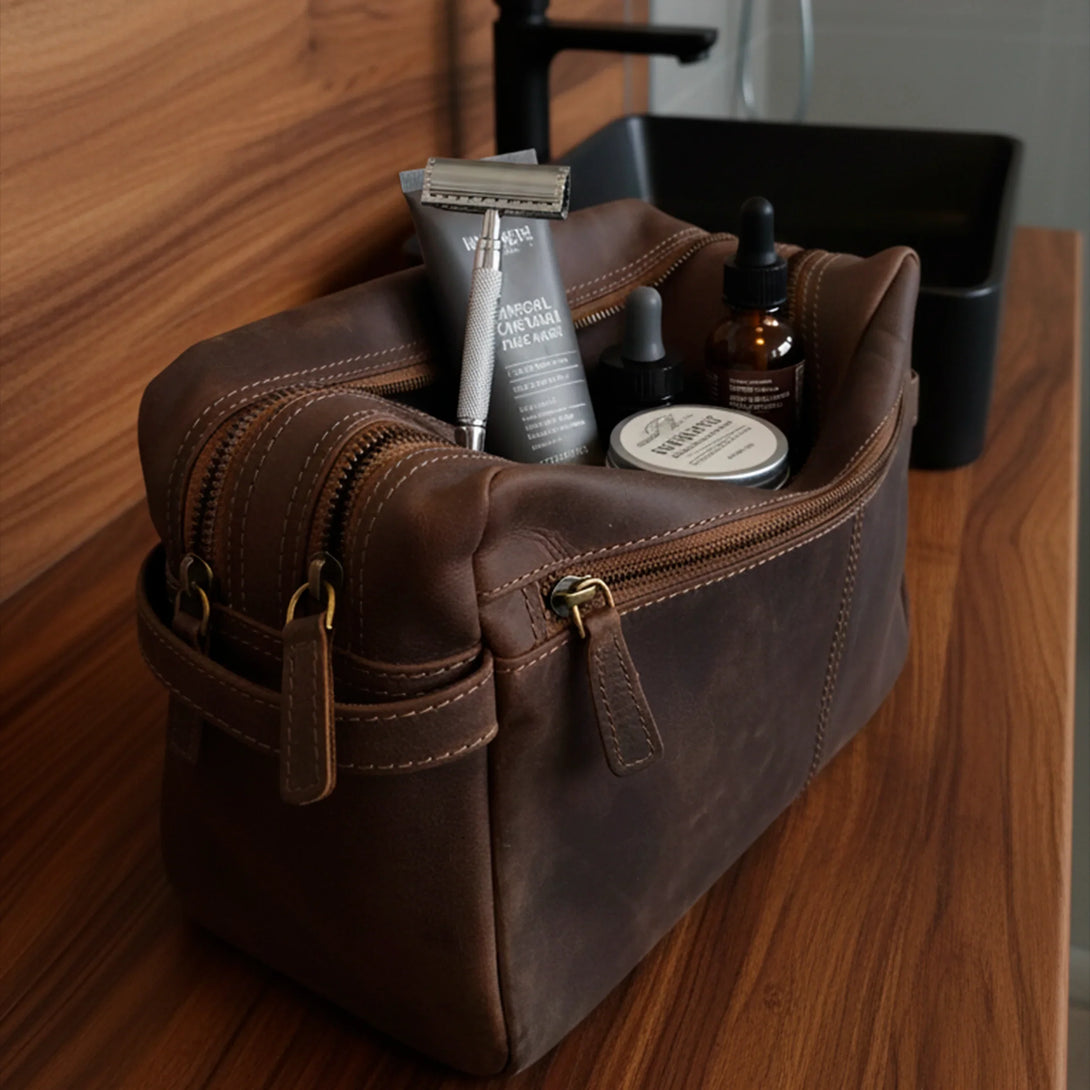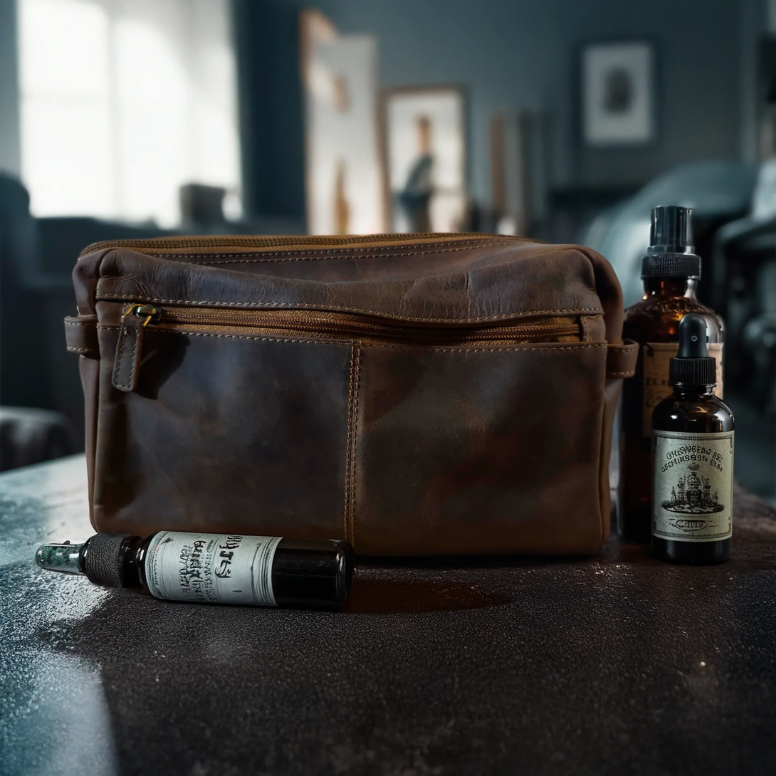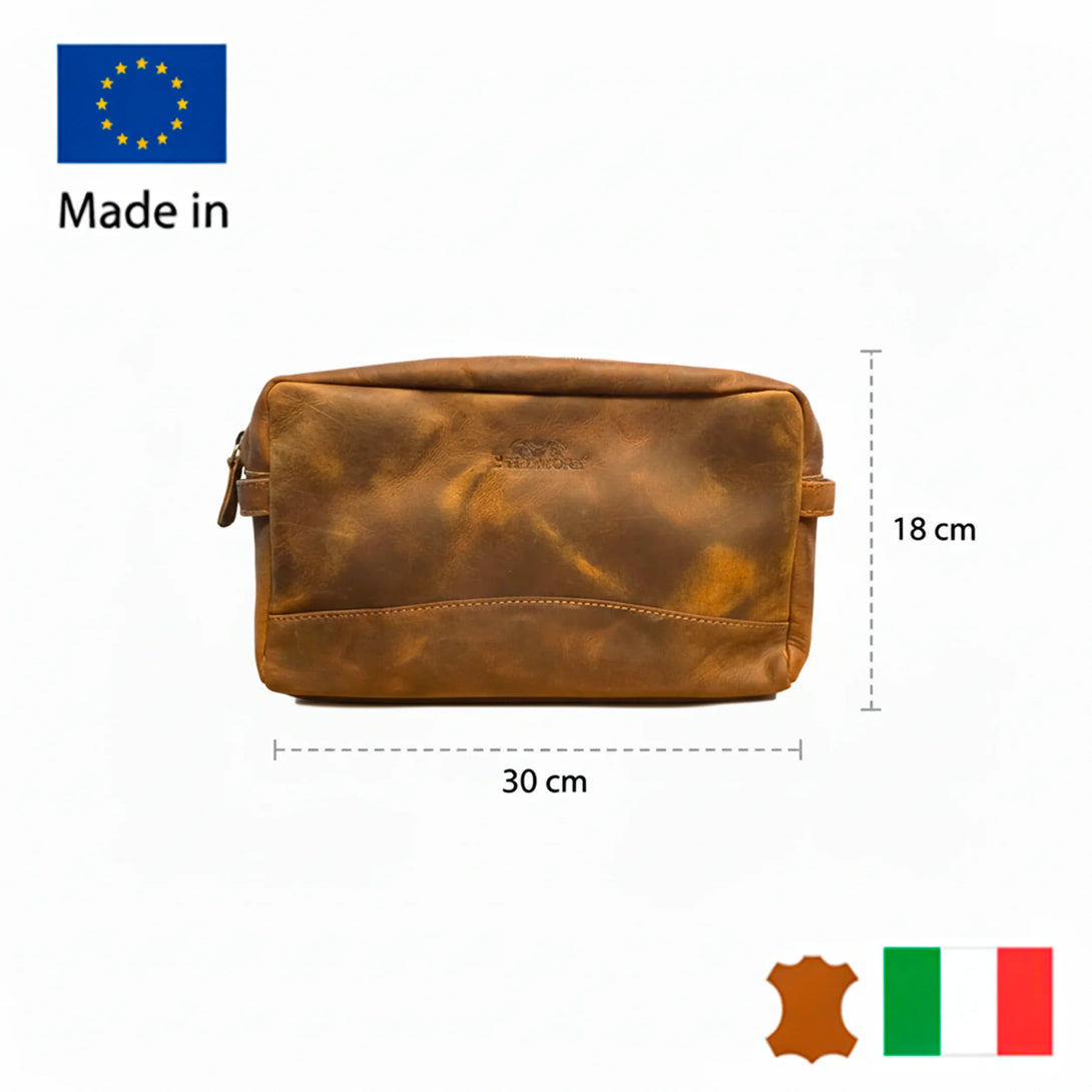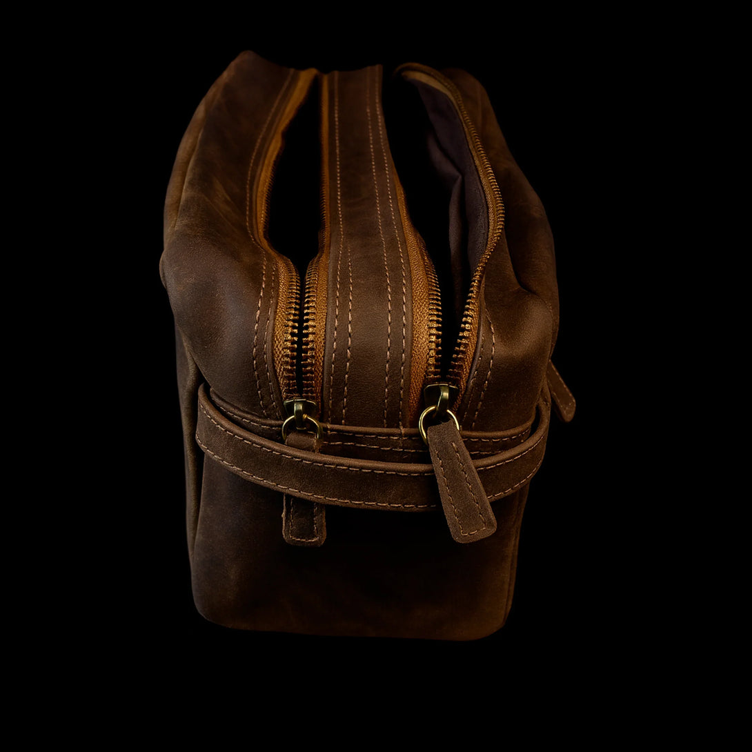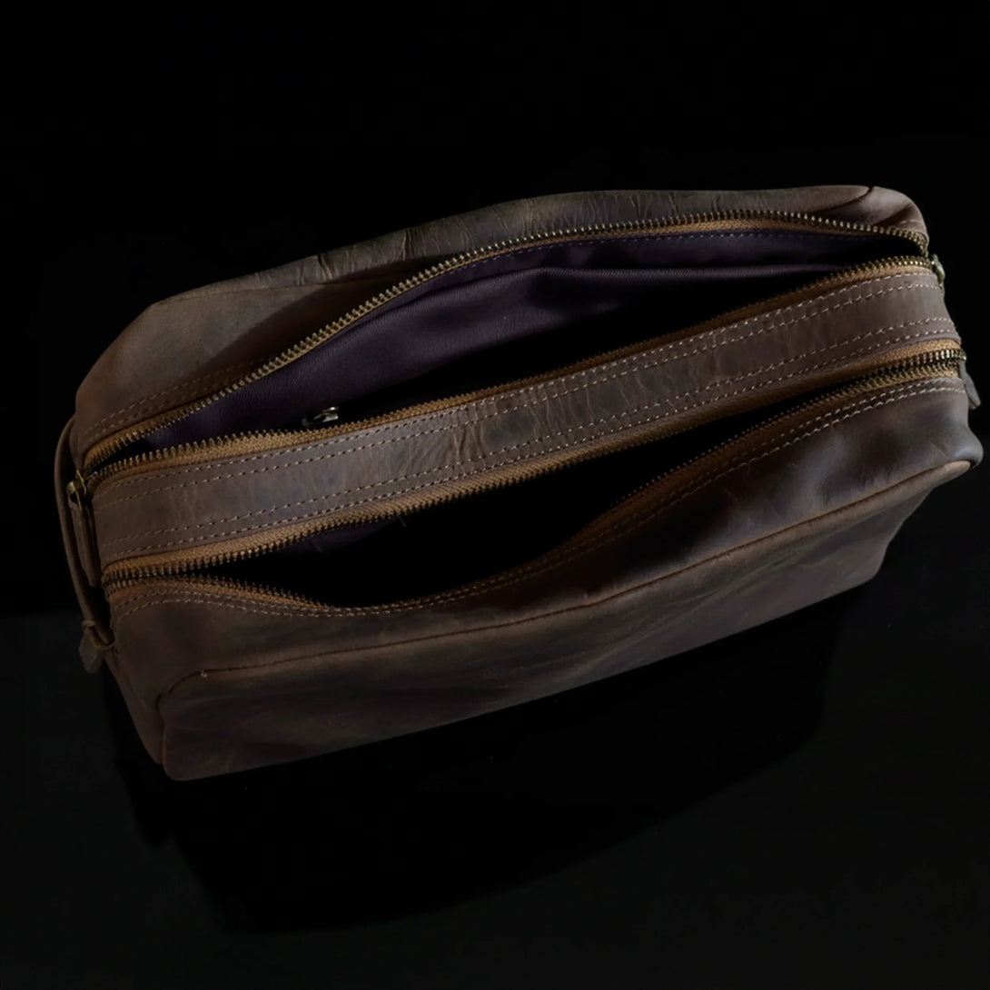 Deze exclusieve grote twee-compartiment toilettas is vervaardigd van hoogwaardig natuurlijk rundernubuckleer in een rijke vintage bruine afwerking. Ontworpen voor zowel reizigers als professionals, houdt het je verzorgingsproducten perfect georganiseerd en gemakkelijk toegankelijk.
